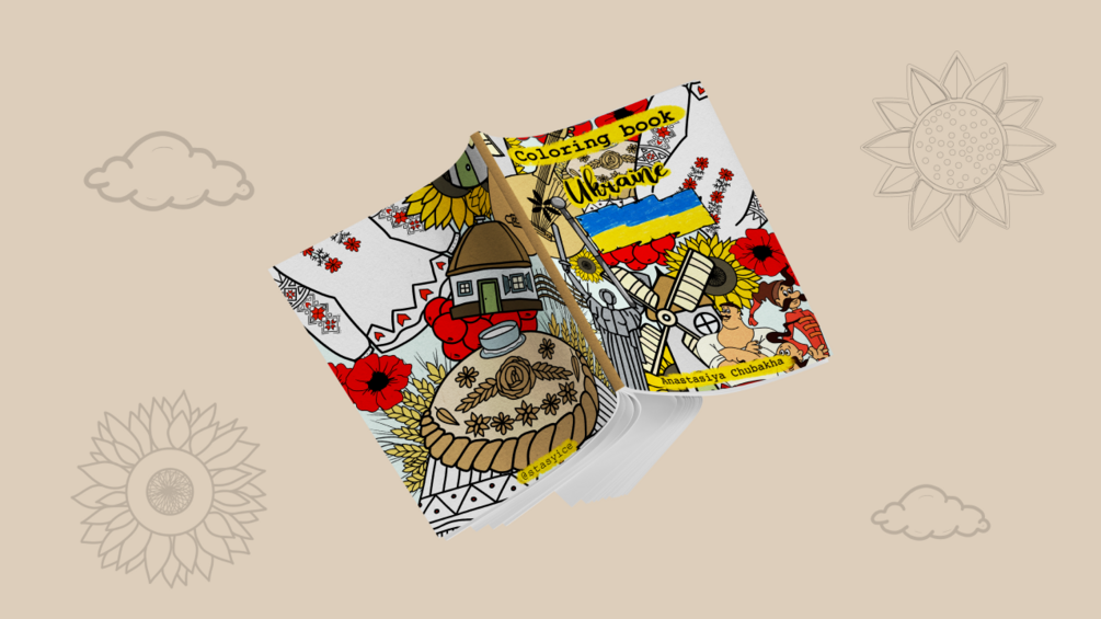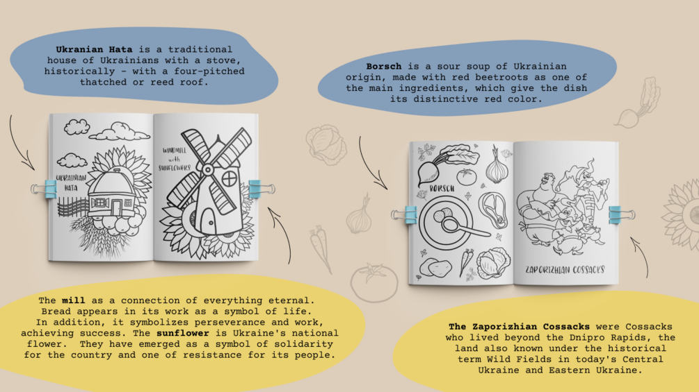 This coloring book was created to show the beauty of our country to the world. Through it, children and adults can expand their knowledge of Ukraine through symbolic coloring, traditional costumes, food, and map of our country.